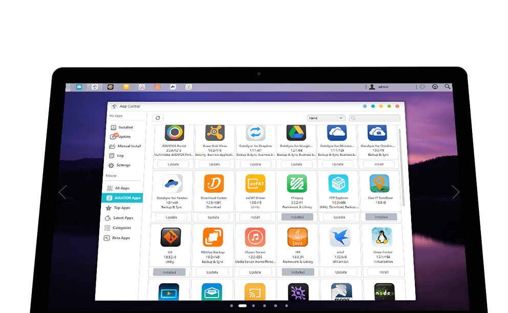 Unleash the unlimited potential of ASUSTOR NAS. The applications that come pre-installed with each ASUSTOR NAS device are just the beginning. At your convenience, you can browse through and download any applications that pique your interest from App Central. Whether your interests lie in business, website construction or even digital home entertainment, App Central has got you covered. With over 200 unique Apps, App Central provides you with the boundless variety of applications that you require to satisfy your digital lifestyle needs. Explore the unlimited potential of ASUSTOR NAS devices while creating a personalized NAS device for yourself.