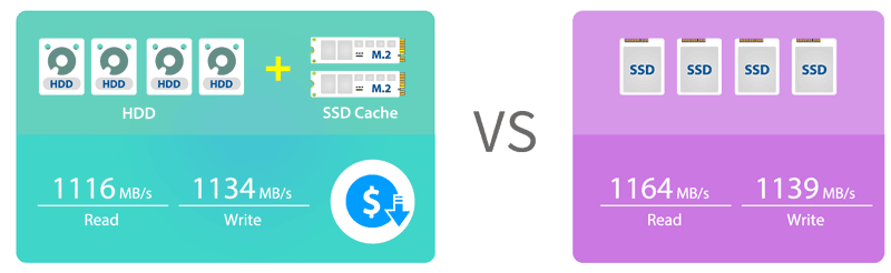 SSD caching on the Lockerstor 10 Pro brings SSD-like speeds to regular hard drives. Turbocharge your NAS by adding one or two SSDs to the M.2 slots inside your Lockerstor 10 Pro. Read and write files at speeds of over 1100 MB/s and watch as even big files are transferred over in seconds.