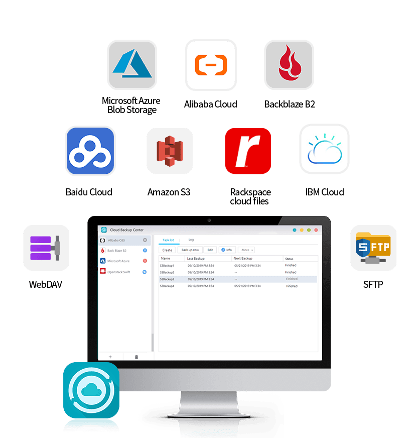 Cloud Backup Center brings support for various business cloud services including, but not limited to Amazon S3, Backblaze B2, Baidu Cloud, IBM Cloud, Rackspace Cloud Files, Microsoft Azure Blob Storage , Alibaba Cloud, SFTP and WebDAV. Control your data with instant and scheduled backups as well as using Cloud Backup Center to create a hybrid cloud that keeps your data online and offline, keeping your data protected.