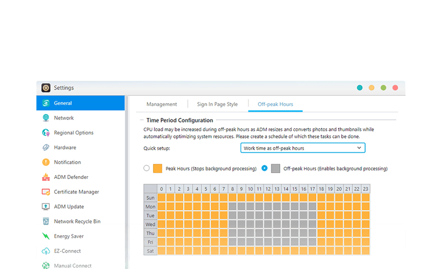 Your time is important, so ADM provides a feature to ensure that your NAS performs at top speed when you want it to. Peak times enable your NAS to turn off certain background processes and maintenance at certain times of the day and are customizable while off-peak hours will return background processes to their normal state. Enable off-peak hours when the NAS is not actively being used, for example, when sleeping to ensure an optimal experience.
