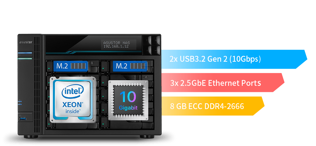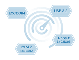 The all new Lockerstor 10 Pro NAS features a powerful Aquantia 10-Gigabit Ethernet port as well as triple Aquantia 2.5-Gigabit Ethernet ports. With a managed switch that supports multiple speeds, take advantage of up to 10 Gbps of speed on the 10-Gigabit port or up to 7.5 Gbps on all 2.5-Gigabit ports.