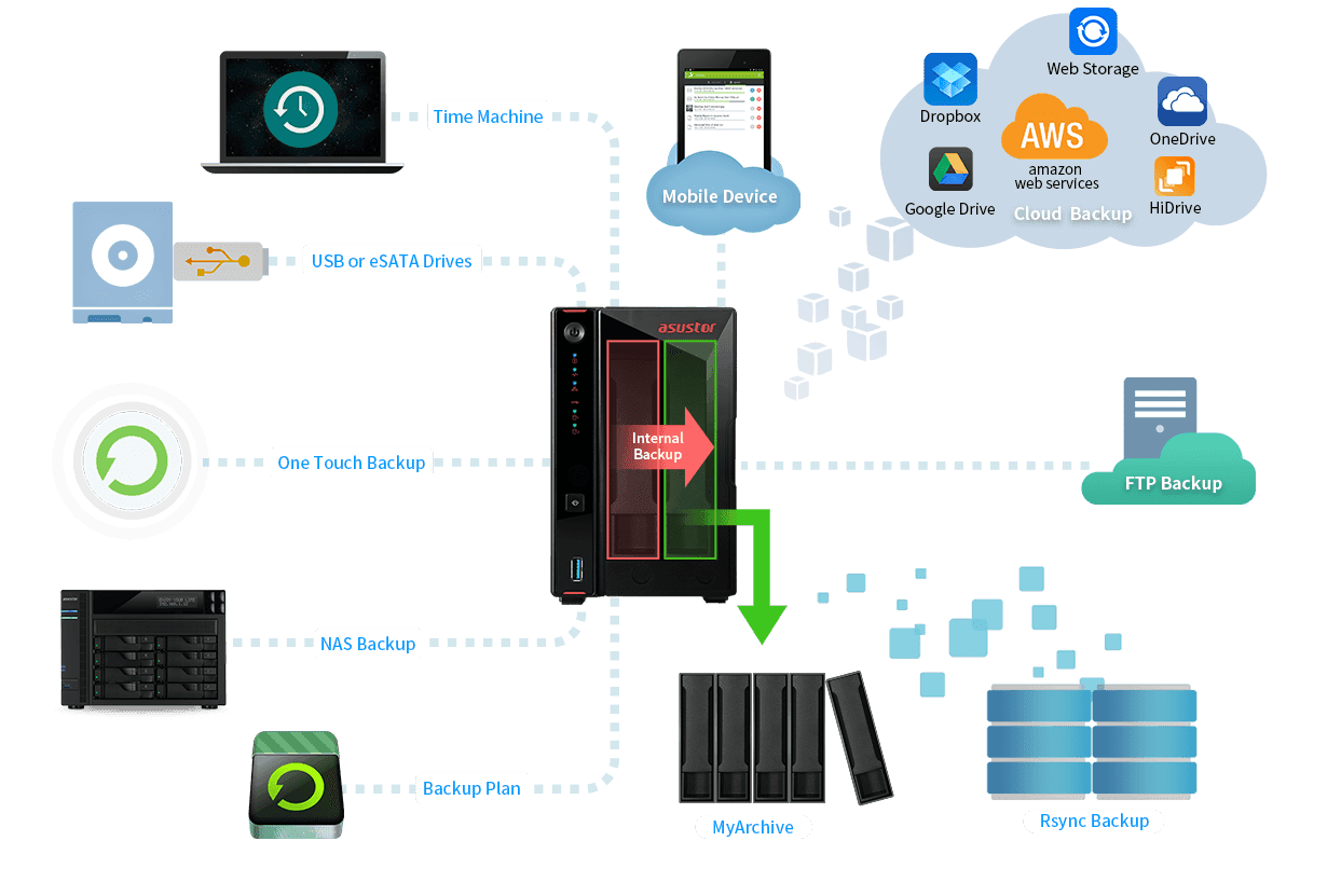 ASUSTOR’s comprehensive backup solution provides more than twelve backup options, including, but not limited to Amazon S3, Dropbox, Google Drive, and OneDrive. ASUSTOR Backup Plan for Windows as well as Time Machine for macOS provide easy backups for desktop and laptops while MyArchive removable hard drives provide long term storage. Btrfs is now supported and with Snapshot Center, can take snapshots of your information in the event of unintentional modification. Restore previous versions easily with Snapshot Center.