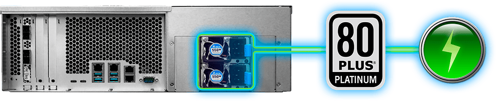 The Lockerstor 12R pro and 16R pro are equipped with server–grade redundant 80 PLUS Platinum PSUs. The efficient power supplies installed ensure stability when running your NAS for various apps like virtualization. The included power supplies also increase energy efficiency as they are up to 94% efficient in 50% load and remain efficient at almost any load. This enables enterprise customers to save power and money while also being green. With internal hard drive hibernation, the Lockerstor 16R pro consume only 51.5 W of power while normal operation only consumes 121.7 W of power.